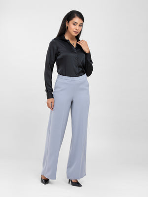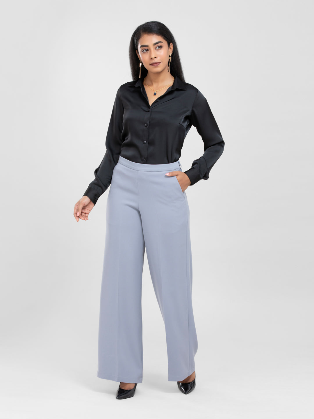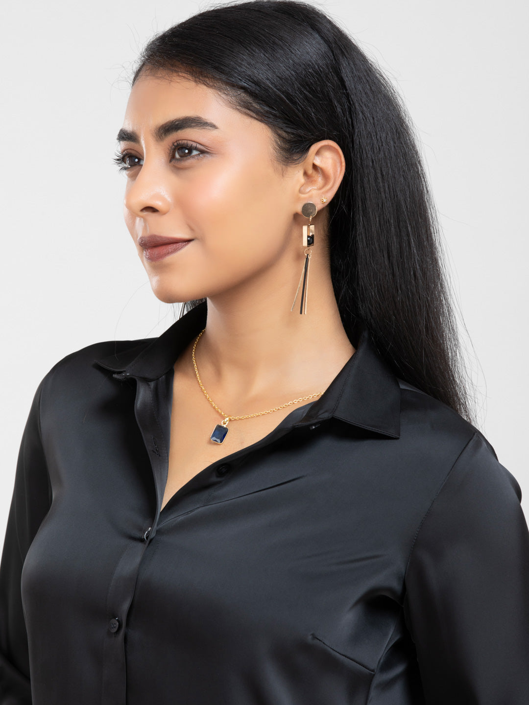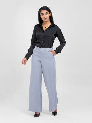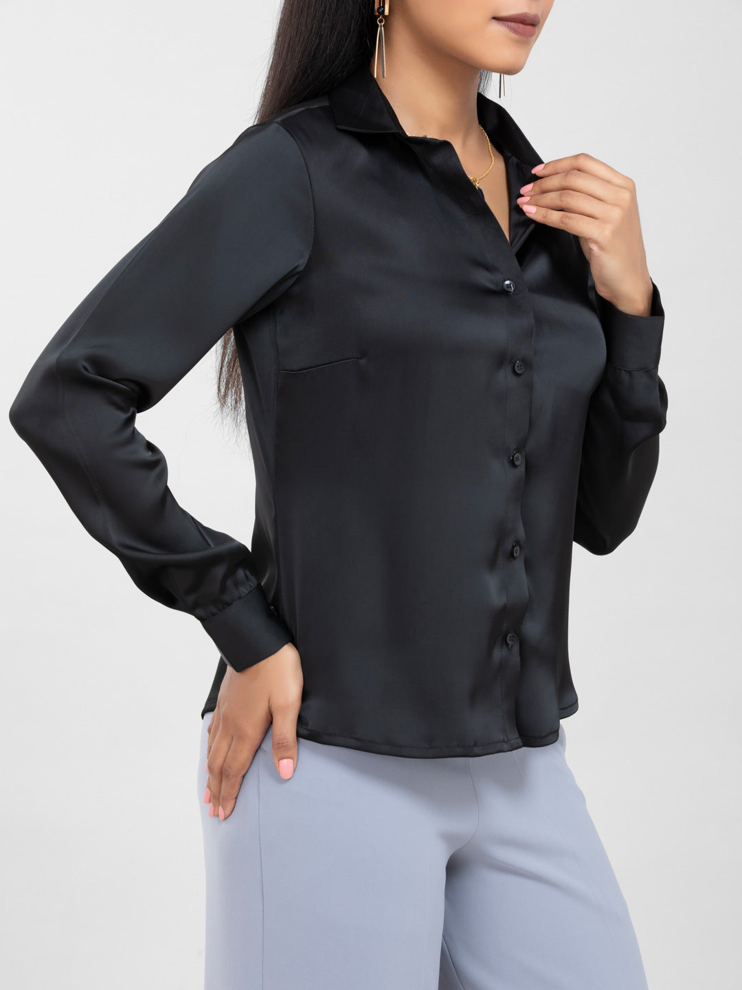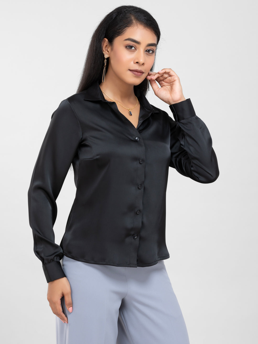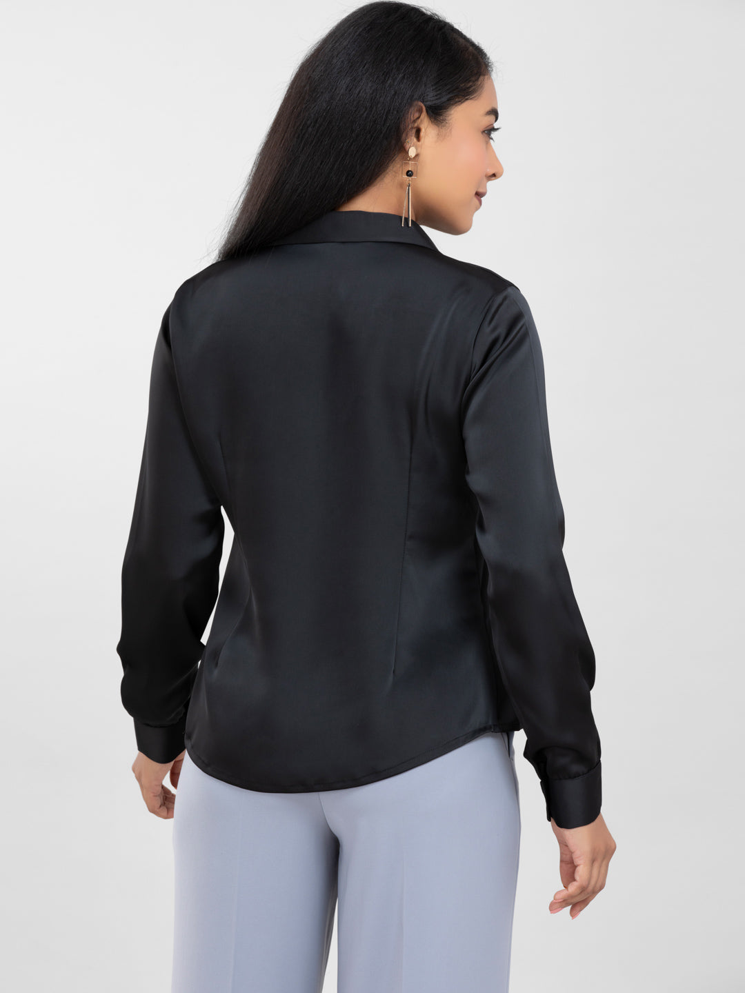 Black Spread Collar Satin Shirt for women
