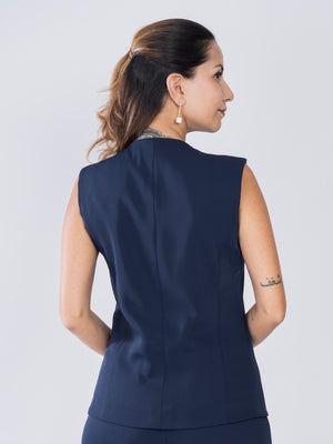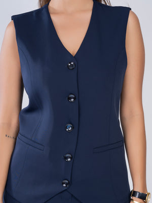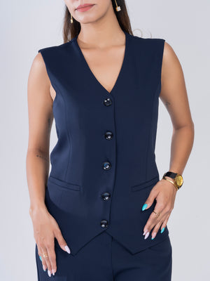 Blue solid waist coat. It has a v neck, front button closure, sleeveless with two front pockets.